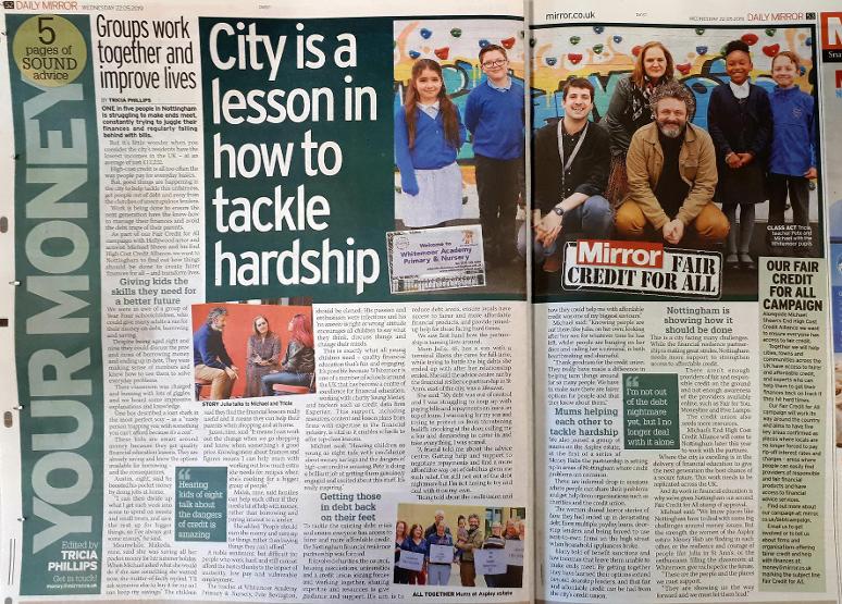 The visit resulted in two page spread in the Mirror on the 22 May. The Mirror has given Nottingham it's second Fair Credit For All stamp of approval for the financial education work. What's more, Michael's End High Cost Credit Alliance will come back to Nottingham later this year for work with partners.
